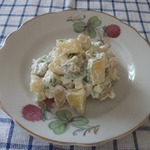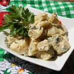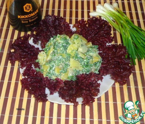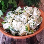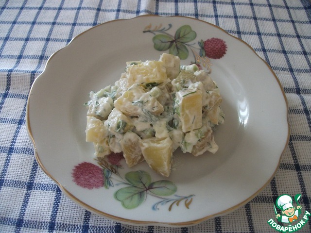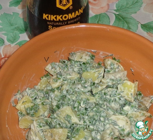 Искала такой салат на сайте и не нашла. Салат сочетает в себе отварной молодой картофель и зеленый лук. Заправка из сметаны и соевого соуса отлично дополняет салат.