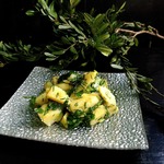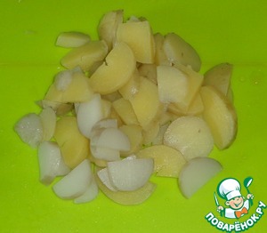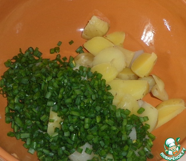 Молодой картофель очистить и отварить в подсоленной воде до готовности. Слить воду и остудить. Теплый картофель нарезать соломкой или кубиками.