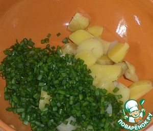 Молодой чеснок очистить и мелко нарезать. Добавить к картофелю и зелени.