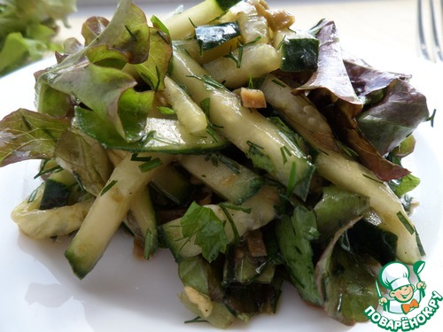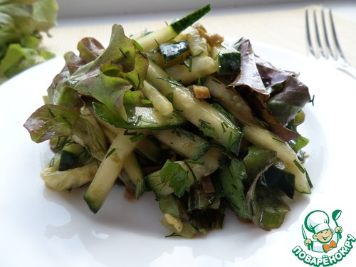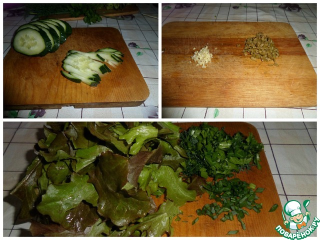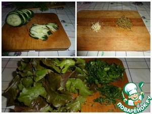 Нарезаем огурцы соломкой, измельчаем чеснок, мелко нарезаем зелень и оливки. Листья салата нарвать руками.