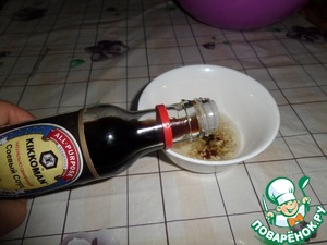 В чашку наливаем чесночное масло, добавляем чеснок, щепотку черного молотого перца и соевый соус. Хорошо перемешиваем.