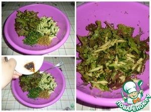 В рабочую чашку выкладываем нарезанные огурцы, зелень, оливки и листья салата. Добавляем приготовленную заправку. Аккуратно перемешиваем.