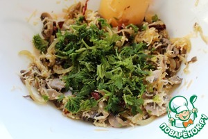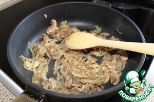 Добавляем к луку грибы, и продолжаем обжаривать до выпаривания жидкости, даем остыть, солим и перчим.