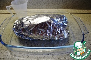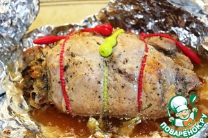 Скатываем в рулет, скрепляем жгутами или зубочистками, заворачиваем в фольгу и укладываем в жаропрочную посуду. Туда же наливаем примерно 1-2 стакана воды, зависит от объема посуды и отправляем в нагретую до 200 град духовку на 2 часа. При необходимости воду надо будет подливать.