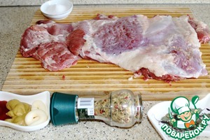 Мясо отбить до толщины куска 1 - 1,5 см, с двух сторон посолить, поперчить, приправить сухими специями, смазать маринадом (смешать майонез, горчицу и кетчуп).