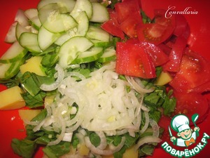 Огурцы и лук нарезать полукольцами, помидоры небольшими кусочками.
