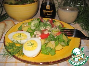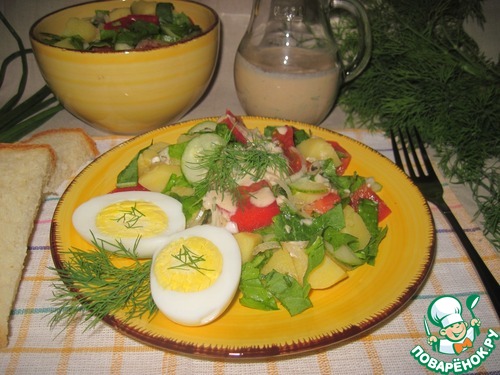 Летнее блюдо из картофеля, нежной зелени и свежих овощей с легкой заправкой на основе ряженки.