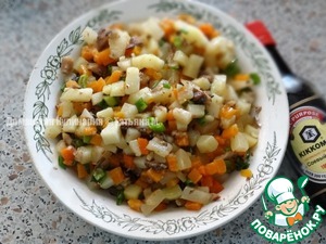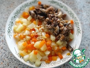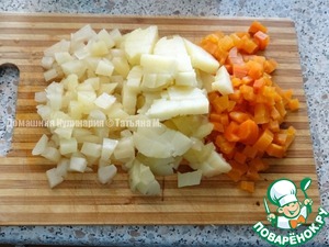 Одинаковыми кубиками порезать морковь, картофель, ананас (количество ингредиентов должно быть примерно равное);