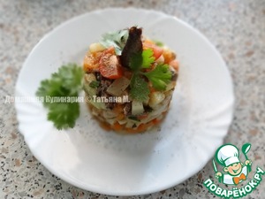 С помощью кольца уложить часть салата на тарелку (получается 3 порции);