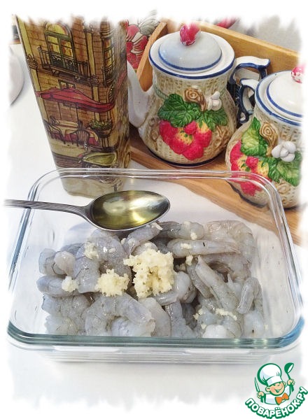 Креветки надо предварительно замариновать. Для этого их нужно почистить, помыть, обсушить бумажным полотенцем. Посолить, добавить выдавленный через пресс чеснок и оливковое масло, всё вместе перемешать, закрыть контейнер и убрать в холодильник на пару часов. Я обычно это делаю на ночь.