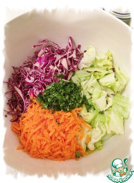 Все овощи помыть, обсушить. Морковь почистить и натереть на крупной тёрке. Капусту тоненько нашинковать. Листья салата порезать небольшими квадратиками. Кинзу мелко порубить. Соединить всё в одной посуде.