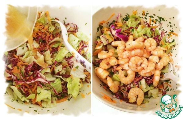 Полить заправкой, перемешать. Добавить креветки и ещё раз перемешать.