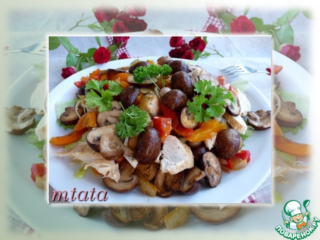 Достаточно сытный салат, вполне может заменить ужин. Воздушность и сочность ему придают листья салата, а необыкновенный аромат - соевый соус Киккоман, шампиньоны и болгарский перец. Единственная сложность - не съесть заранее замаринованное в соевом соусе и сваренное мясо, которое получается настолько вкусным, сочным и ароматным, что оторваться от него просто невозможно!