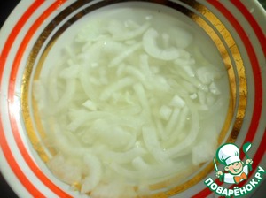 Лук нарезать полукольцами и залить маринадом из воды, уксуса, соли и сахара на 20 минут.