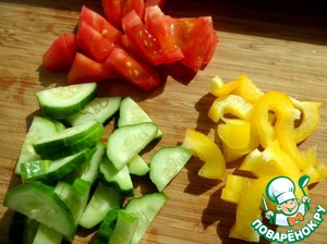 Перец, помидор и огурец нарезать небольшими ломтиками.