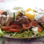На тарелку выложить листья салата, на него помидор, огурцы, болгарский перец, тунец и маринованный лук. Все сверху сбрызнуть соевым соусом ТМ "Киккоман". Далее кладем яйца пашот и подаем к столу.