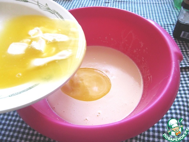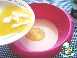 Вливаем в эту смесь растопленное сливочное масло, взбиваем до однородной консистенции.