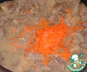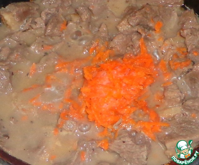 Добавляем чеснок, тушим до готовности. Морковь и мясо должны стать мягкими.