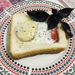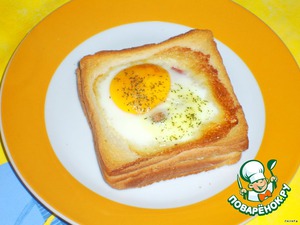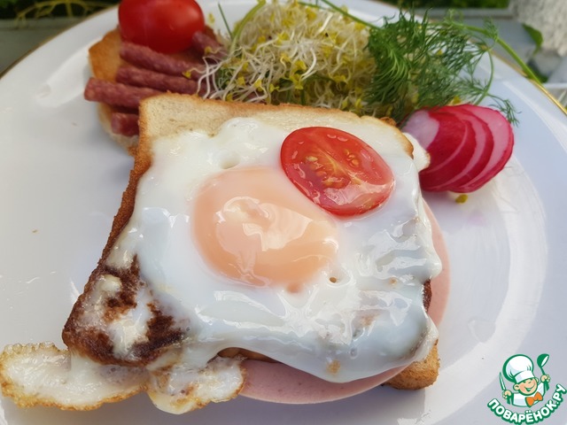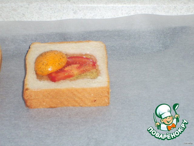 На кусочек тоста (который целый), положить кусочек колбаски, я клала 2, потому как слишком тонко порезанная