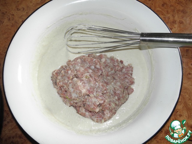 В готовое тесто добавить фарш в соотношении 1:1 ( у меня ушло 0,5 кг), хорошо перемешать. Жарить на нагретой сковороде в растительном масле. Должны быть как оладушки. Я пользовалась десертной ложкой. Фото сделать пока не успела. Исправлюсь.