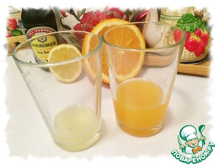 Выжать сок из половинки лимона и половинки крупного апельсина. Чеснок пропустить через пресс.