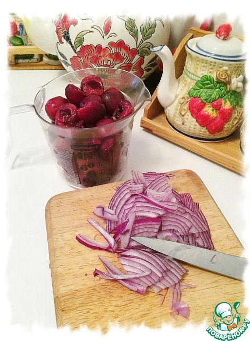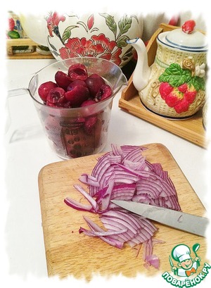 Лук нарезать тонкой соломкой. Черешню разделить на половинки и вынуть косточки.