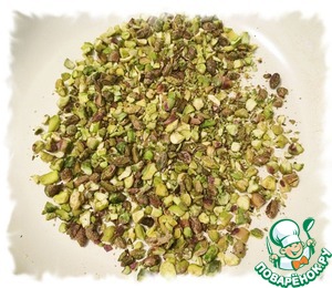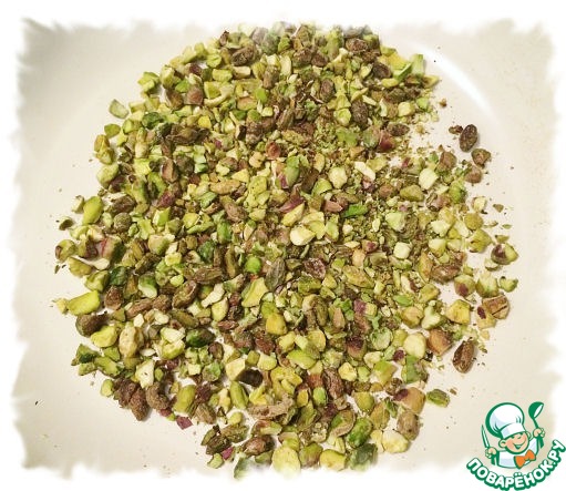Фисташки немного порубить и слегка подрумянить на сухой раскалённой сковороде.