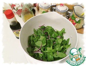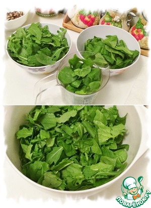 Шпинат и рукколу помыть и обсушить бумажным полотенцем ( у нас продаётся зелень уже мытая и сухая, у кого так же, то снова мыть конечно же не надо). Отмеряем нужное количество зелени. Если попадаются большие листики, то порвать из руками. Соединить зелень в отдельной посуде.
