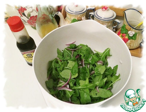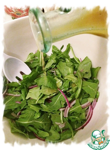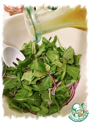 Полить листья с луком заправкой, предварительно ещё раз взболтав её и всё перемешать.