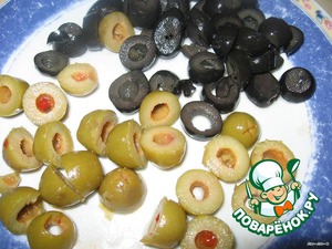Добавить оливки и маслины, соль, перец, сладкую паприку (по вкусу).