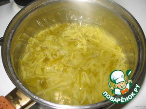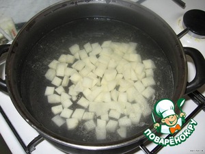 В 3-х литровую кастрюлю налить 1,5 л. воды. Картофель нарезать кубиками и варить до готовности.