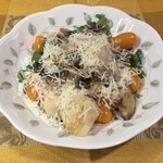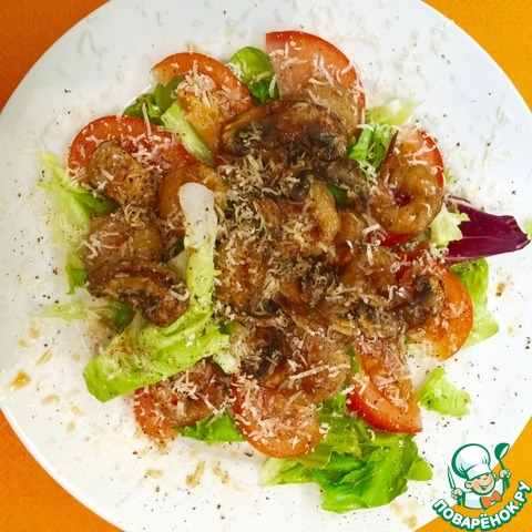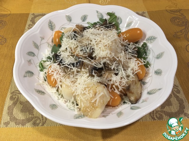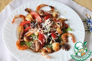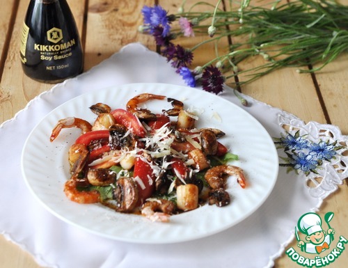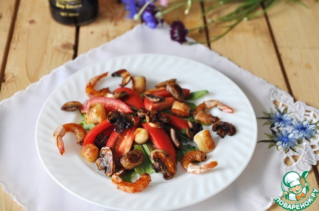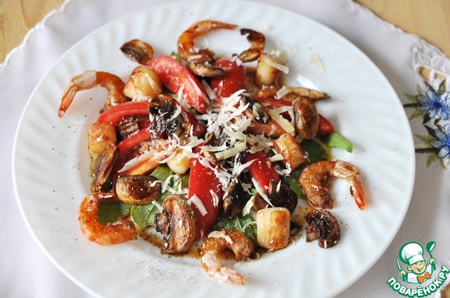 Сверху кладём морепродукты и шампиньоны-гриль.
