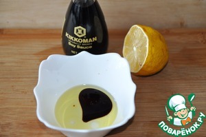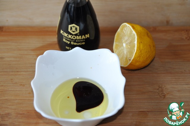Готовим заправку. Берём соевый соус ТМ "Киккоман" (1 ст. ложку), оливковое масло и сок лимона, перемешиваем вилкой.