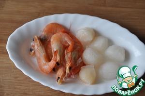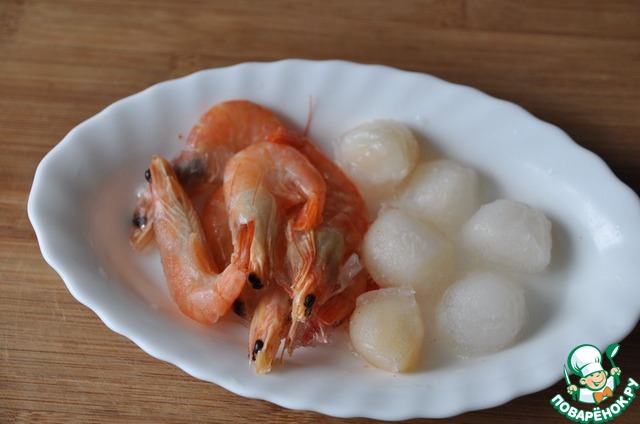Берём мороженые креветки и гребешок и даём им самопроизвольно оттаять.