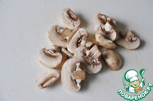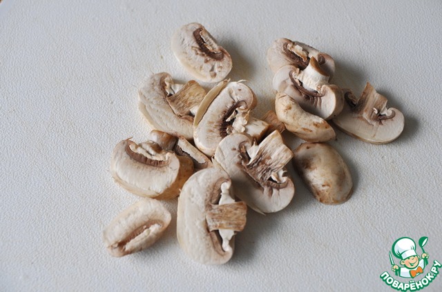 Шампиньоны моем, обсушиваем бумажным полотенцем и режем пластинками.
