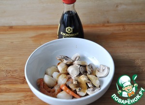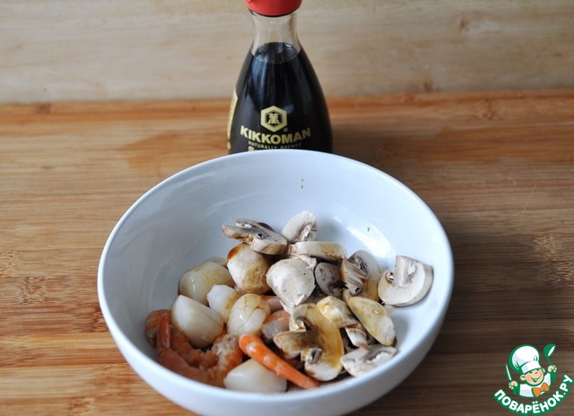 Берём соевый соус ТМ "Киккоман" (2 ст. ложки) и заливаем им морепродукты и нарезанные шампиньоны. Отставляем мариноваться 15 минут.