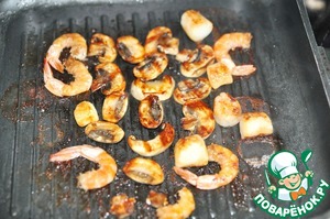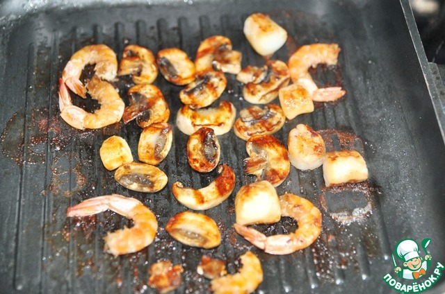 Морепродукты и шампиньоны обсушиваем бумажным полотенцем и обжариваем на сковороде гриль (смазанной кисточкой маслом).