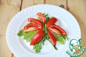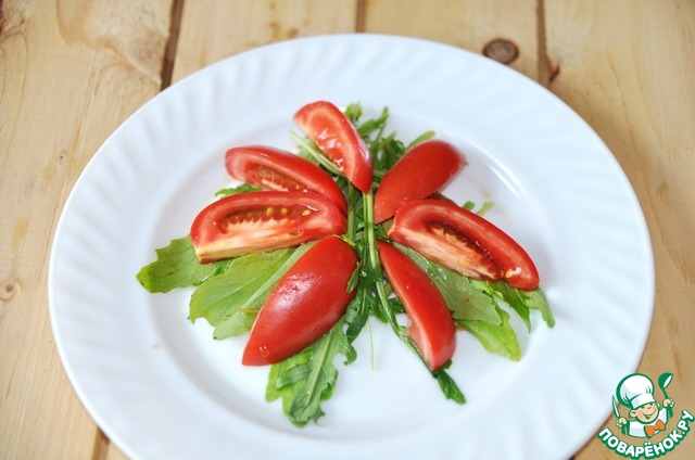 Помидор режем сегментами и кладём сверху рукколы, можно взять несколько разрезанных пополам помидорок черри.