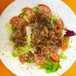 Поливаем салат заправкой, посыпаем свежемолотой смесью перцев и тёртым пармезаном.