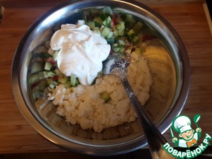 Творог смешиваем с редисом, огурцами и зеленью. Чуточку подсаливаем и заправляем сметаной. Не переборщите со сметаной. Масса должна быть густой. Если положите побольше сметаны - овощи пустят сок и салат "потечёт"