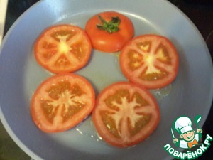 Помидоры для салата нужны плотные. Нарезаем их кружочками около 0,6-0,7 см. На сковороде раскаляем масло, чтобы пошёл легкий дымок. И кладем помидоры на раскаленную сковороду. Жарим РОВНО 3 (ТРИ) СЕКУНДЫ с одной стороны и тут же снимаем. Помидоры не должны приготовиться, но на обжаренной стороне чуточку подпечься.
