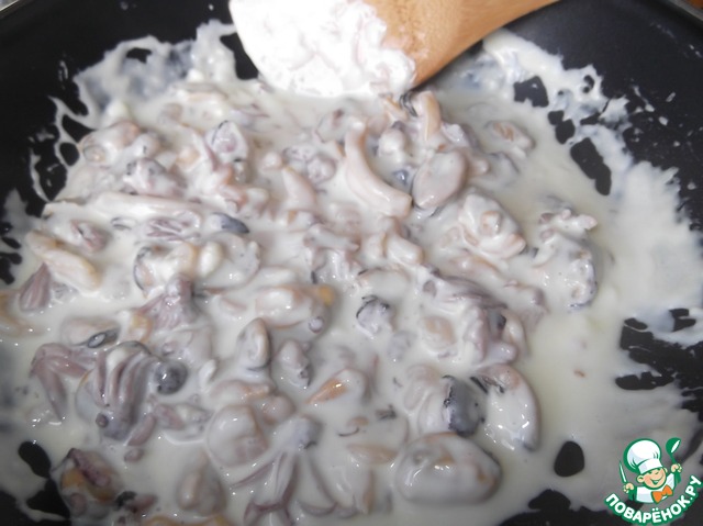 Смешиваем соус с заранее отваренными морепродуктами ( мидии, кальмары, осминоги, креветки, каракатица)