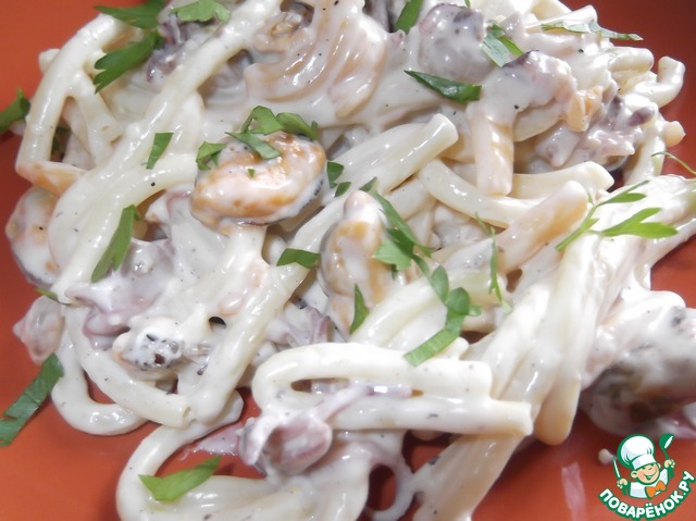 Морской коктель с сырным соусом и макаронами
