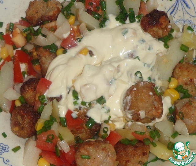 Картофель соединяем с мясными шариками. Добавляем помидор порезанный кубиками.