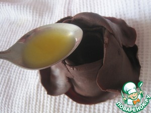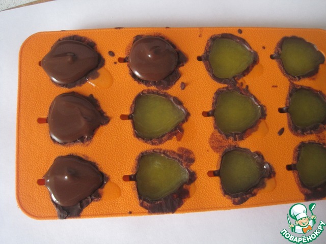 Закрываем донышко конфет растопленным шоколадом, обращая внимание на края конфет, они должны быть полностью покрыты, иначе из конфет потечет сок. Конфеты вынимаем. Когда сок внутри конфет растает можно наслаждаться.