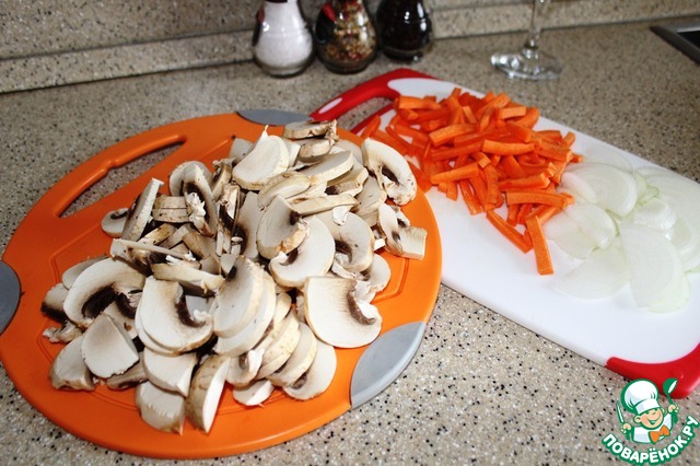 • Нарезаю морковь - брусочками, шампиньоны- ломтиками, лук - четвертинками колец.