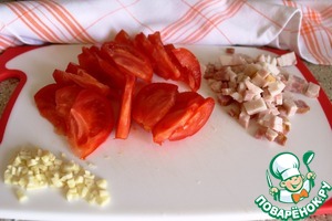 Помидор нарезаю тонкими ломтиками, чеснок - мелко, бекон - небольшими кусочками. Пару ломтиков бекона оставляю.