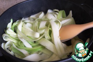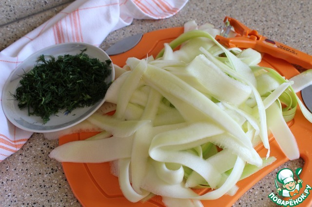 Зелень укропа нарезаю мелко, а кабачки - тонкими полосками, с помощью овощерезки.