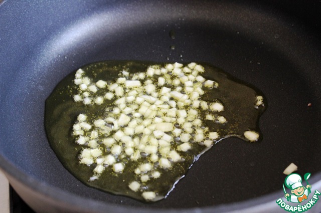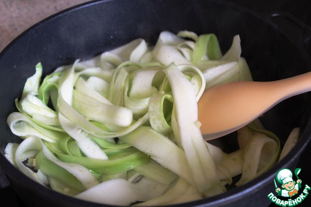 Добавляю к чесноку кабачки и, при постоянном помешивании, жарю до мягкости на небольшом огне.