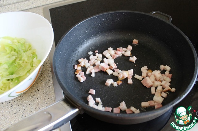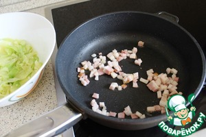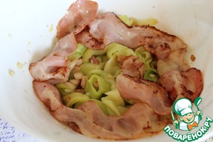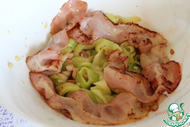 Перекладываю кабачки с чесноком в миску, а на той же сковороде обжариваю до золотистости бекон.